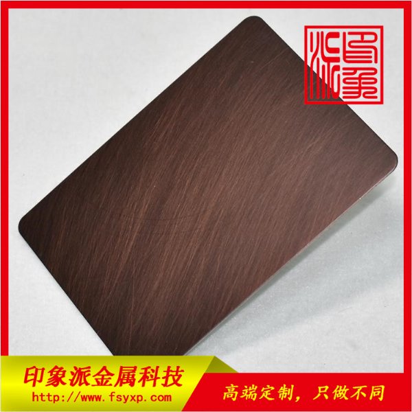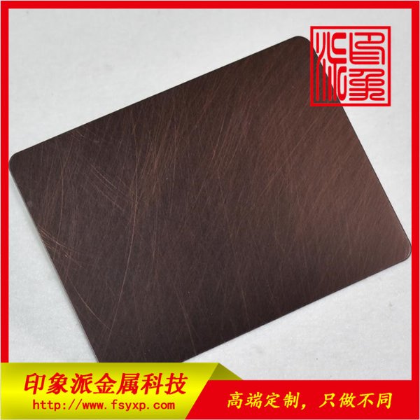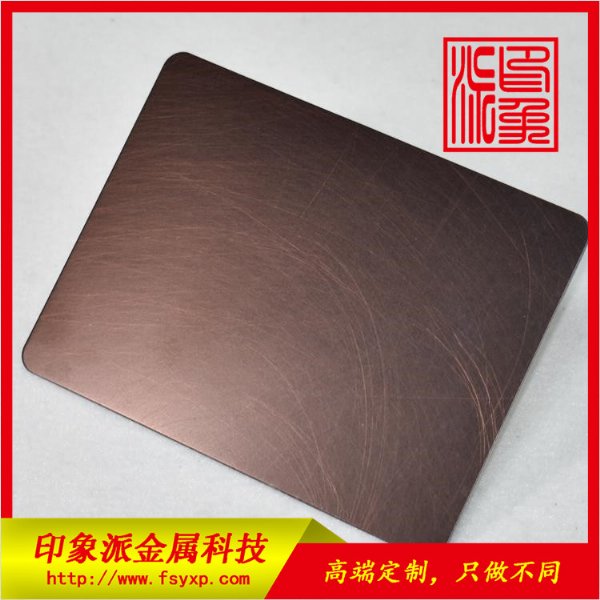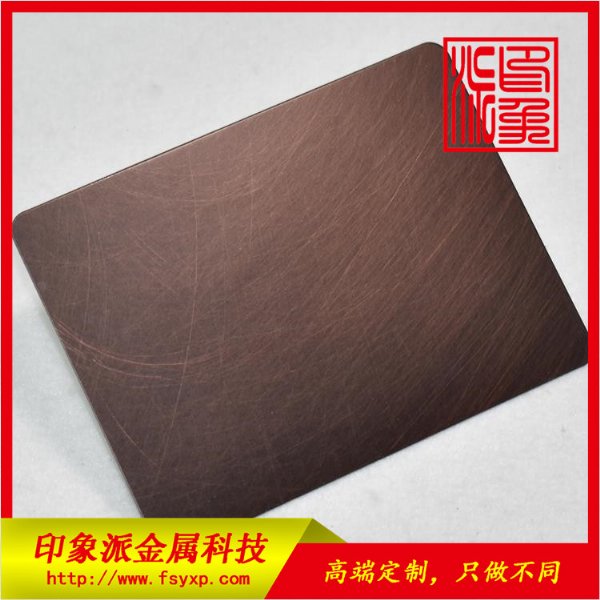 不锈钢彩色乱纹板优点:本厂生产的不锈钢彩色发纹板无色差,颜色均匀光亮,能生产出各种颜色,可进行局部的和纹,拉丝,嵌金,局部钛金等各式复杂工艺处理,实现图案明暗相间,色彩绚丽的效果。用途:家居装饰、扶手、防盗网、拉手、广告灯箱、日用五金、水暖器材、锁具、灯饰、餐具等等。主打颜色:钛金色,香槟金,淡青铜,日本金,锆金,玫瑰金,玫瑰红,古铜,红铜,黑灰,深黑,紫金,深褐色,宝石蓝,茶色,炫彩,不锈钢本色,咖啡色等。不锈钢表面有2B、BA、8K、磨砂、HL拉丝、喷砂以及多种表面加工一起的组合工艺等。 - 佛山市印象派金属科技有限公司