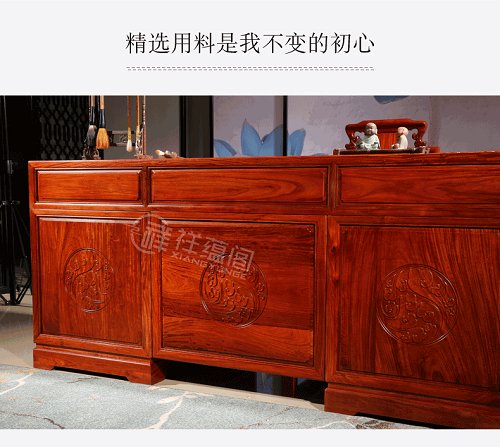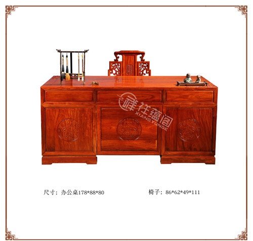 这款书桌是缅甸花梨材质的,缅甸花梨木,从字面上看,很多人以为是产自缅甸的,实际上缅甸花梨木不止产生于缅甸,其实老挝、泰国、越南、柬埔寨这几个国家都有出口的。由于缅甸花梨木木质优越,木纹清晰,结构细且匀,生长轮颇明显;心材桔红、砖红或紫红色,常带深色条纹,而且有些部位还有明显的虎皮纹。另外,缅甸花梨木,其香味悠远醇厚,不张扬。