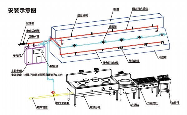 厨房设备细水雾灭火装置可配装可燃气体浓度探测器,当厨房内因泄漏而积聚的可燃气体的浓度超标时,装置发出报轚倍号并自动关闭燃气阀。