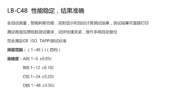 随着纸板和瓦楞纸板生产工艺的不断改进优化,用户也不断调整包装材料的应用,以降低包装和运输成本,重型和大型包装则以纸代木,由于常规的耐破强度或边压强度测试已无法满足高强度材料的测试要求,而纸板戳穿强度测定仪则可以满足高强度纸板测试要求,尤其是高强瓦楞纸板的测试更为显著。LB-C48采用高强度钢构设计,保证冲击测试过程中的稳定可靠。