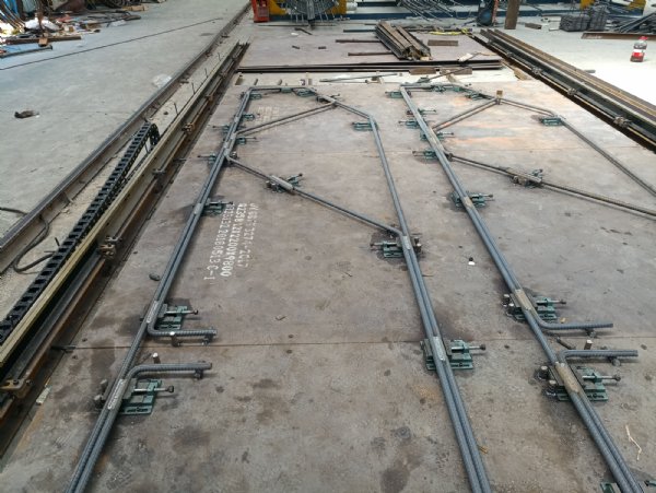 3、将弯曲成型的钢筋固定到1#与2#定型模板上。