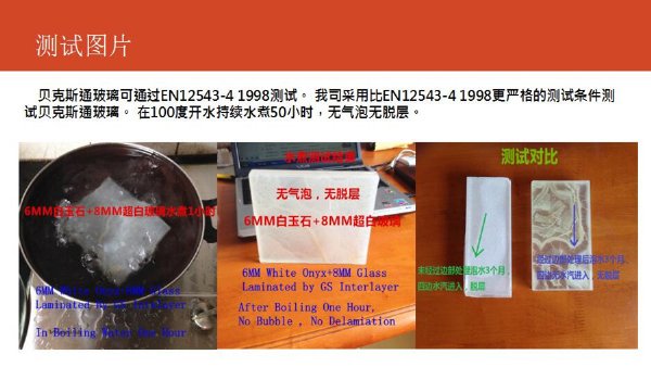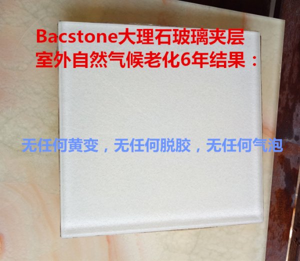 热熔玻璃复合石材是结合石材跟玻璃加工技艺,采用高科技无液体胶水革新的生产技术。 天然石材薄层通过独有的GS有机夹层复合到玻璃中间。在整个加工过程中,不采用任何液体树脂胶水通过特殊的边部处理技术生产高质量的bacstone玻璃。Bacstone玻璃具有高耐湿气、高抗脱层、高抗冲击、高耐黄变、高耐化学污染等五高特性。以革新的高科无液体胶水技术做后盾结合石材和玻璃加工工艺,bacstone玻璃是高端奢华透光石材玻璃复合板的理想选择,可应用于室内和室外透光石材玻璃复合板。