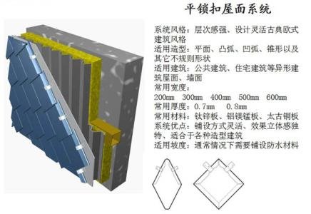 6.环保材料:是绿色材料,符合可持续发展理念 钛锌板安装系统:直立锁边系统