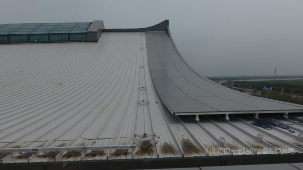 在对屋面功能性装置安装、装修、维护过程中,需要进行高空作业,而工人经常随便的把安全带扣在不稳定的结构上,而这些固定物不能承受突然而来的冲击力,一旦发生意外,工人便会从高处坠下造成人员及财物损失。因此,为防止屋面施工高空安全事故的发生,需要在金属屋面安装安全防坠落装置。