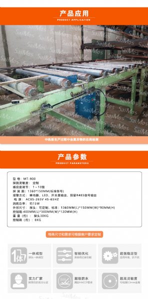 MT-900金属探测仪是我司为保护中纤维板厂的砂光线而单独研发的一款新产品。在中纤板的生产过程中,因为各种原因,会不时的在中纤板内夹杂各种金属物,如螺丝,螺帽,螺杆等,这些金属杂物混在纤维板内,轻者导致客户投诉,重者在砂光工艺段中,经过砂光机时,产生大量火花,引起粉尘仓起火或爆炸,照成严重人员伤害和生产事故。对此,我司根据中纤板的生产工艺特点,研发了MT-900金属探测仪,它采用了多项新技术,同时吸收和借鉴了国外同类产品的优点,无缝的嵌入中纤板的自动生产线中,工作稳定可靠,抗干扰能强,灵敏度可调,为中纤板的安全生产保驾护航。
