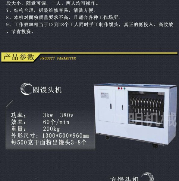 全自动小型馒头机是制作馒头的理想设备,它符合国家食品机械、食品卫生规定及要求。全自动小型馒头机整机设计合理,结构紧凑,外型整齐美观,体积小,重量轻,噪音小。效率高,操作简单,清理方便,清洁卫生,揉制出的馒头要比手工揉制的馒头外形光滑美观,且比手工揉制的馒头更富嚼劲看,香而可口。经用户使用反映良好。该设备适用于食堂、旅馆、饭店、部队、厂矿企业、招待所及学校部门等使用,物美价廉、实惠方便。 - 任县功明机械厂