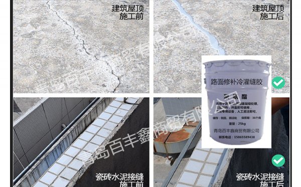 甘肃百丰鑫路面冷补灌缝胶首先是冷补的,是不需要加热使用的,其次灌缝胶是单组分的,直接就可以使用的,施工操作简单化,不需要对路面裂缝进行开槽,进而节省了大型机器设备的成本。百丰鑫路面冷补灌缝胶聚氨酯材质的,在耐候性方面性能突出,可以在-50℃至60℃情况下良好施工,并且胶体固化后在此温度下不会流淌变形或是变脆开裂,胶体具有很大的弹性,不会造成裂缝二次开裂,防水效果优异,可以有效防止路表积水渗入裂缝内,阻止水侵害路基,保证路面使用寿命。