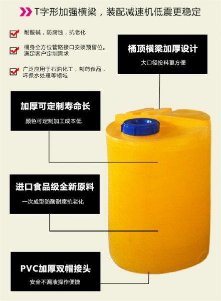 大型塑料搅拌桶塑料储罐一次成型整体性好,无焊缝,**渗漏,抗冲击性能强,拉伸强度高,抗氧化、抗老化性能好,符合卫生食品标准。