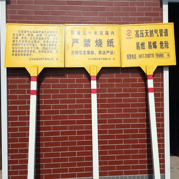 复合材料燃气玻璃钢标志牌真正免保护,不同于水泥、石头号材料需要守时每年去上油漆、喷字,保护工时费用高,产品表面文字根底坚硬,耐磨耐久。也可按用户单位提供的桩号,路程数,路径方向指示箭头,保护电话等信息材料逐个定做我公司出产的复合材料燃气玻璃钢标志牌安装办法:发掘所埋深度坑,前后左右十字交叉穿入两根25 CM钢筋,水泥石子固定即可。