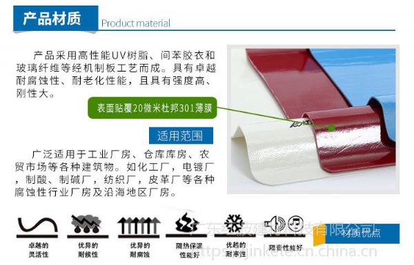 产品介绍:产品采用高性能UV树脂、间苯胶衣和玻璃纤维等经机制板工艺而成,表面贴覆20微米杜邦301薄膜。广泛适用于化工厂,电镀厂,制酸、制碱厂,纺织厂,皮革厂,化肥厂等各种腐蚀性行业厂房及沿海地区厂房等各种建筑物。