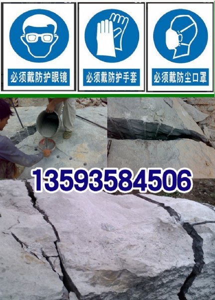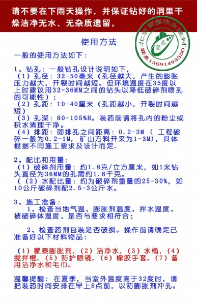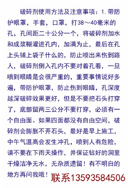 北京混凝土破碎剂 无声膨胀剂厂家直销(1) 破碎剂不属于危险物品。 因而在购买、运输、保管、使用中,不受任何限 (2) 施工过程安全。 不存在爆破时产生的震动、空气冲击波、飞石、噪音、有毒气体和粉尘的危害。 (3) 施工简单。 破碎剂用水拌合后灌入炮孔即可,无须堵塞;不需专业工种。 (4) 需破则破,需留则留。 按照要求,设计适当的参数,可达到有计划地分裂、切割岩石和混凝土的目的。 静态破碎法 ,是近年来发展起来的一种破碎(或切割)岩石和混凝土的新方法,亦称静力迫裂和静力破碎技术。 1、作用原理 将一种含有钼、镁、钙、钛等元素的无机盐粉末状用适量水调成流动状浆体,直接灌入钻孔中,经水化反应,使晶体变形,随时间的增长产生巨大膨胀压力(径向压应力和环向拉应力),缓慢地、静静地施加给孔壁,经过一段时间后达到大值,将混凝土或岩石胀裂、破碎。 因为一般被解体的岩石或混凝土均属,脆性材料的抗压强度大,抗拉强度小,其抗拉强度远小于抗压强度。岩石的抗拉强度为 4 -10Mpa ,混凝土的抗拉强度约 1.5 - 3.0Mpa ,约相当于其抗压强度的 1/10 - 1/20 。而通常静态破碎剂的膨胀压力可达 30 - 50Mpa 。所以,合理的破碎设计(装药量、孔径、孔深和孔间距的确定)是能够使孔眼周围的介质受到充分破坏的。只要约束继续存在,破碎剂就有持续产生或残留一定程度的膨胀压力的性质,因而能继续增大或产生新的裂缝。 经测定,在温度为 20 ℃、水与破碎剂之比为0.3:1 时,其体积将四倍。 2、适用范围 (1)混凝土和砖石结构物的破碎拆除; (2)各种岩石的破碎或切割。 或作二次破碎。但不适用于多孔体和。 3、优点:(安全、方便) (1) 破碎剂不属于危险物品。 因而在购买、运输、保管、使用中,不受任何限制。 (2) 施工过程安全。 不存在爆破时产生的震动、空气冲击波、飞石、噪音、有毒气体和粉尘的危害。 (3) 施工简单。 破碎剂用水拌合后灌入炮孔即可,无须堵塞;不需专业工种。