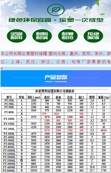 常用塑料水箱型号有:PT-200L;PT-300L;PT-400L;PT-500L;PT-800L;PT-1000L;PT-2000L;PT-3000L;PT-5000L;PT-6000L;PT-8000L;PT-10000L;PT-15000L;PT-20000L;PT-30000L;PT-40000L; PT-500000L