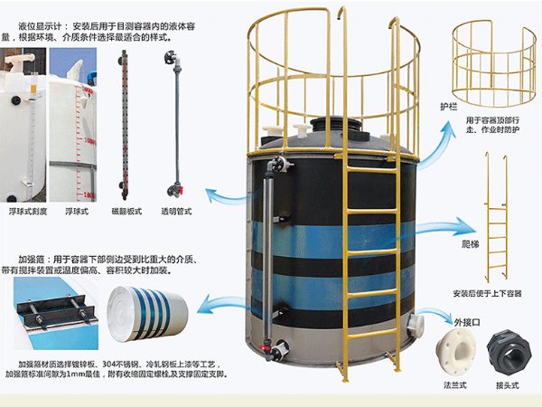 PE储罐可以装盐酸。可设计性灵活。 PE储罐集装桶有三种颜色可供选择,白色为常规吨桶,蓝色和黑色为避光吨..