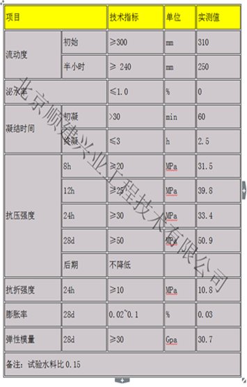 由特种胶凝材料、膨胀材料、外加剂和钢纤维等组成的特殊混合材料,具有无收缩、早强、高强、耐久等特征,主要性能: