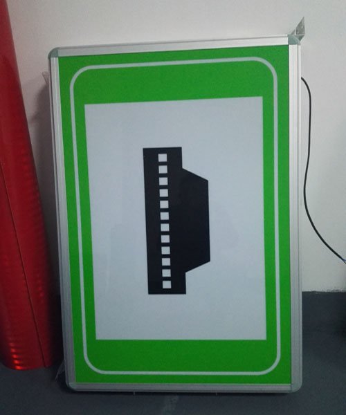 紧急停车带指示标志设置于隧道紧急停车带入口前5米,底部与检修到顶面高差为2.9米。标志版面尺寸为50cm*80cm.照明方式为内部照明,双面显示。