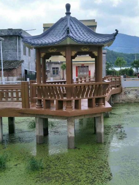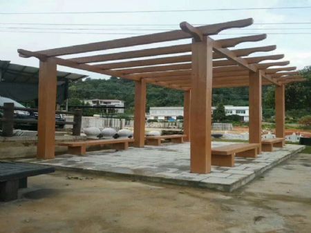 园林景观设施:六角凉亭,葡萄架长廊,仿树桩垃圾桶,仿木纹路边花箱,仿树桩桌凳,仿真树公园大门,仿石仿木草坪栅栏,停车场挡车石等;