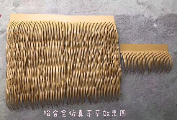 铝制仿真茅草瓦在设计中有草根跟草线,草线外张扬的效果完全可以替代真茅草在屋顶中的效果,他可以做到蓬松感、整齐感、凌乱型、球顶等各种造型,目前是代替真茅草的*理想环保材料。安装简单,无需防护,防火,防腐,使用年限长。颜色可模仿成茅草(稻草)的颜色,它色泽美观高雅、轻质、不生锈、不腐烂、不破裂、不生虫,耐用,偏于安装,是仿天然茅草屋*理想的装饰材料。