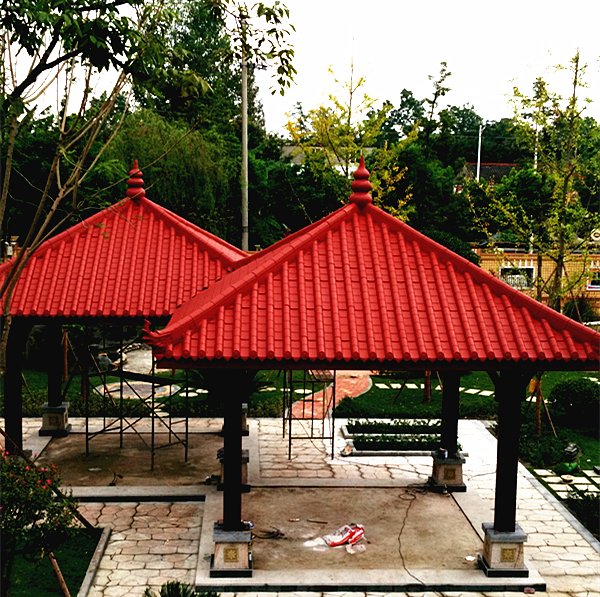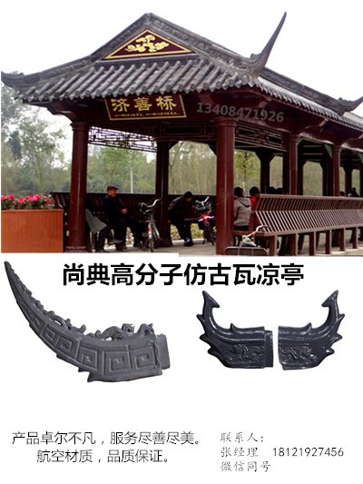 高分子仿古瓦是一种新型免烧琉璃瓦,是通过高温高压模压成型的一种新型屋面瓦产品。产品集防水、隔热、装饰于一体,产品颜色多样,有汉宫红、瓦房灰、天空蓝、玫瑰红、海石蓝、菩萨金、藏金色等多种颜色。从瓦的结构上有大主瓦、中主瓦、小主瓦、檐口瓦和正脊瓦、斜脊瓦、边瓦、沟瓦等,以及龙翘、花翘等品种。产品远销全国及欧美、非洲、中东、西亚等国家或地区,深受用户喜爱。产品品种丰富,既有古典唐宋风格的仿古瓦,又有明清风格的古建瓦,还有现代气息的现代瓦。品种分为高分子仿古瓦、高分子小青瓦、高分子西式瓦。