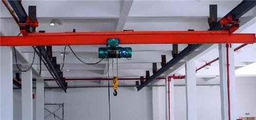电动单梁悬挂起重机是一种运行装置倒在高架轨道上的单主梁起重机,主梁由箱形梁盒与工字钢组焊而成,电动葫芦则能沿工字钢纵向移动,实现升降、移动物料的功能。