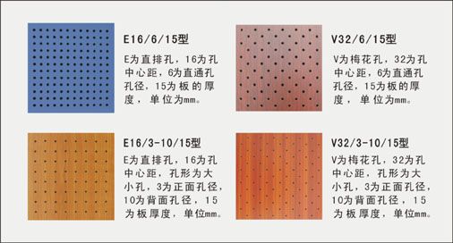 ★孔木吸音板 或称 直穿孔吸音板:是一种在密度板的正面、背面都开圆孔的结构吸声材料。两种吸音板常用于墙面或天花装饰。型号常有16-3、16-6、32-3、32-6,一般是根据孔距、孔径尺寸定义的。