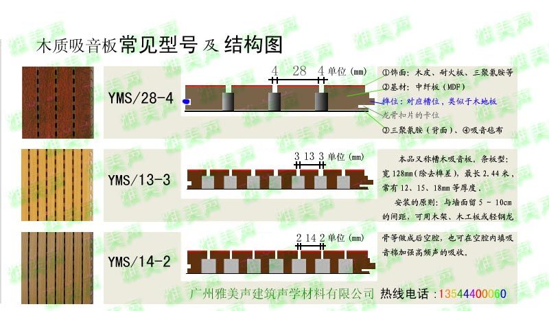 ★槽木木质吸音板规格一般有 28-4、14-2、13-3,代表正面槽之间的间隔距离与槽宽 (单位毫米) 。