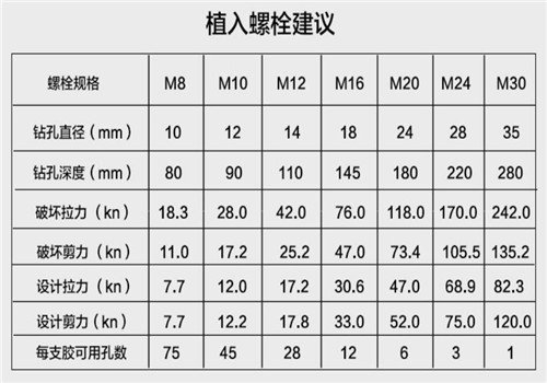 2、采用YJ-502植筋胶,当钻孔深度L与钢筋直径d之比等于10已能满足植筋需要。由于现场施工条件复杂,为保证施工质量。建议钻孔深度(L)为10d-15d-20d。随着钢筋直径(d)的增大。钻孔深度(L)也应逐步加深。