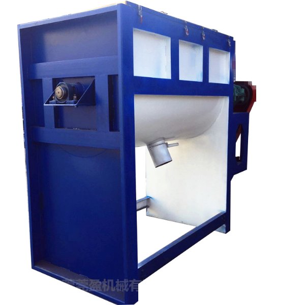 搅拌机卧式筒体底部中央开设出料口,外层螺旋带的蜗旋结构配合主轴旋转方向驱赶筒壁内侧物料至中央出料口出料,确保筒体内物料出料无死角。