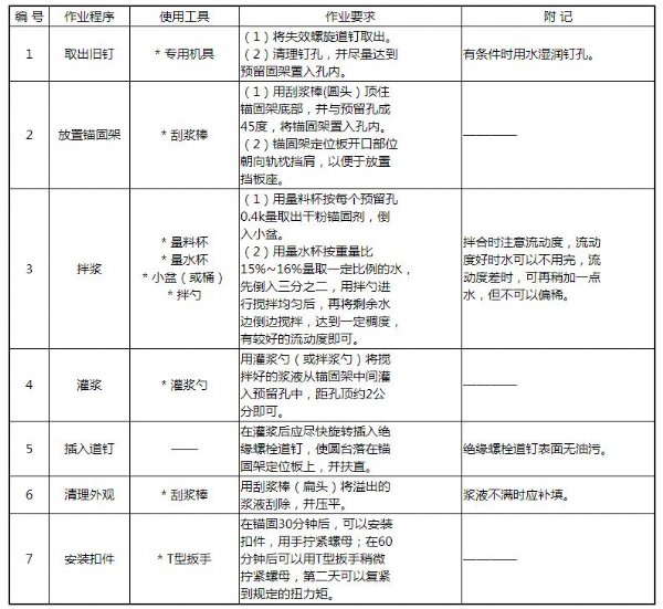1、混凝土轨枕螺纹道钉锚固,一次拌浆数量以在30min内用完为宜,搅拌时间为2~5min。施工作业中必须掌握好流动度和稠稀度,当在灌注过程中流动度降低时,可少加一点水拌合后继续使用。当浆液偏稀时可适当加一点干料拌合后再用。