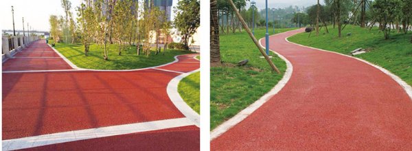 彩色透水混凝土地坪可以设计出各种不同的颜色和图案,其中颜色的添加施工又分为:通体着色和面层着色两种,通过字面意思很好理解,通体着色就是将颜料添加进搅拌材料中一起搅拌,达到着色的效果,其优点是这样搅拌摊铺出来的彩色透水混凝土内外颜色一致;面层着色就是摊铺好的素色透水混凝土,在其表面用喷涂的方式将颜色覆盖上去,优点是简单环保,方便设计出各种复杂的图案。