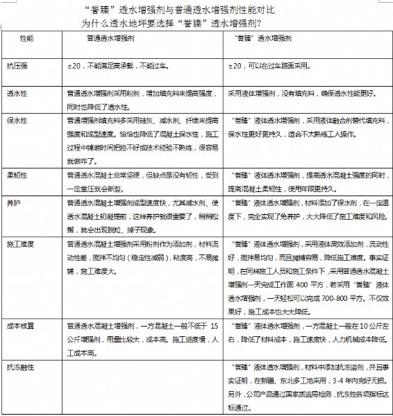 施工难度 “誉臻”液体透水增强剂,采用液体高效添加剂,流动性好,搅拌易均匀,而且摊铺容易,降 低施工难度。事实证明,在同样施工人员和施工条件下,采用普通透水混凝土增强剂一完 成工作面400平方,若采用“誉臻”液体透水增强剂,一天轻松可以完成700-800平方。不效 果好,施工成本也大大降低。