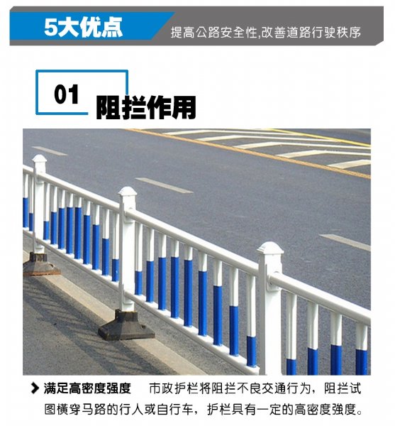 市政护栏广泛使用于市政工程,道路,工厂,开发区,园林广场等场所的安全防护及装饰美化;还可用于小区、庭院、别墅,其线条流畅、简洁美观、富有浓郁的现代气息,让小区生色,让庭院生辉,让别墅具有时代的高品位。;其产品造型美观,而且牢固,防腐性好,安装简单、维修方便、容易清洗、经济实用,免除维修,结构美观,与环境协调性好。是美化城市环境工程的*产品!