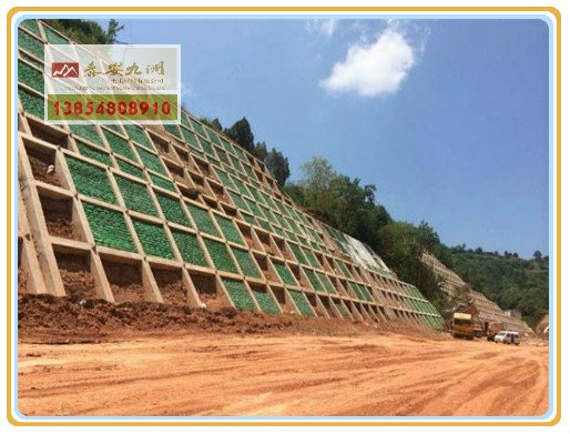 植生袋应用于高速公路边坡绿化工程中,当边坡坡度较大时,直接码放会存在塌方的风险。为避免此种情况,增加坡面的稳定性,要先在坡面建造混凝土框架。