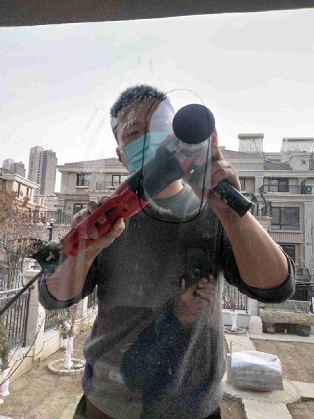 时手持抛光机稍用前倾力,给玻璃稍微施压。