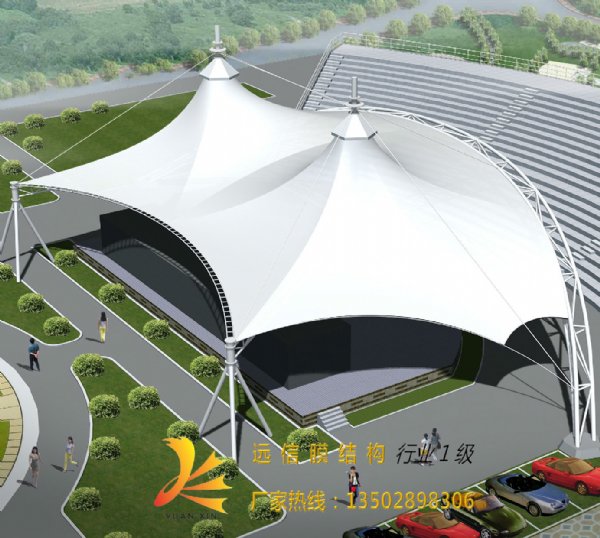 1、舞台张拉膜结构的共同曲面外形使其具有激烈的雕塑感,膜面经过张力到达自平衡。