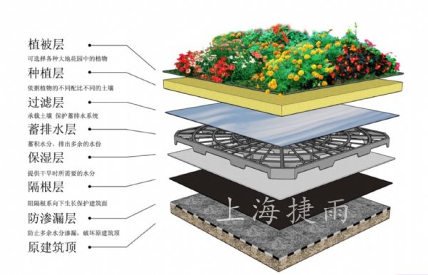 2、该系统在种植顶板底部设置有完善的下渗雨水收集系统,包括高分子防水异形片并且能够保持屋面水位处于较低水平,保持土壤的透气性,保证植系的正常生长。并可作为防水层的柔性保护层,替代传统的混凝土保护降低工程造价。