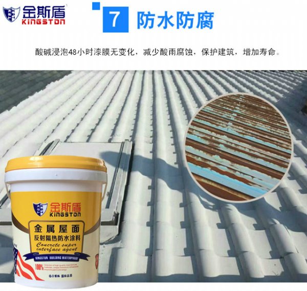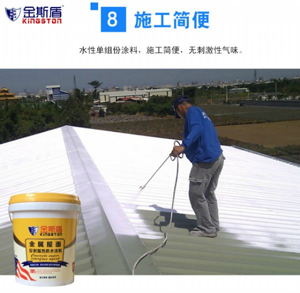 金斯盾金属屋面把射隔热防水涂料表层涂料具有优良的隔热和防水效果,反照功能显著,能迅速散发掉基材聚集的热量,可降低基材表面温度20℃,有效节省空调费用20%~70%,是真正的绿色节能产品。