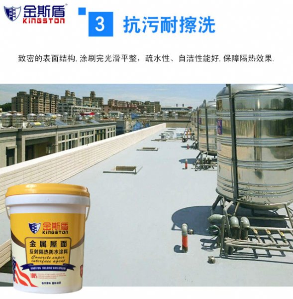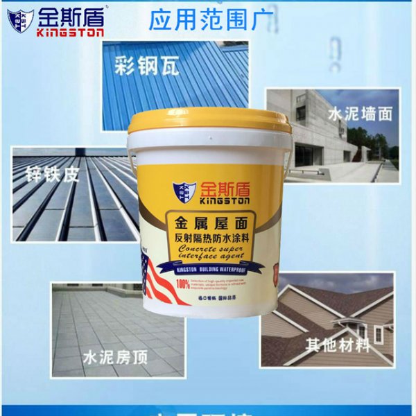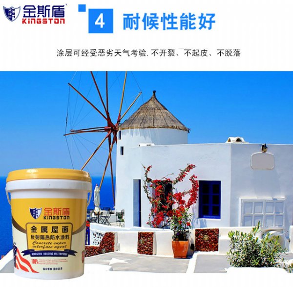 金斯盾金属屋面反射隔热涂料操作简单,使用效果明显,*无害,绿色环保。是工厂在夏季降低温度,提升工人劳动力的重要法宝。建筑物在屋顶涂刷隔热涂料就像行人在炎炎的日光下撑了一般遮阳伞一样,不让太阳给建筑加热从而达到室内降温的效果。实验测试证明,使用和未使用隔热涂料室内温度差高达10℃以上,就相当于居室温度在35℃,防水隔热涂料涂刷隔热涂料后会下降到25℃以下左右,在夏季这个温度使*适合人体需求的,即能减少空调的使用率减少电能消耗,又能降低空调排放的废气对空气的污染,起到节能、环保的功能。