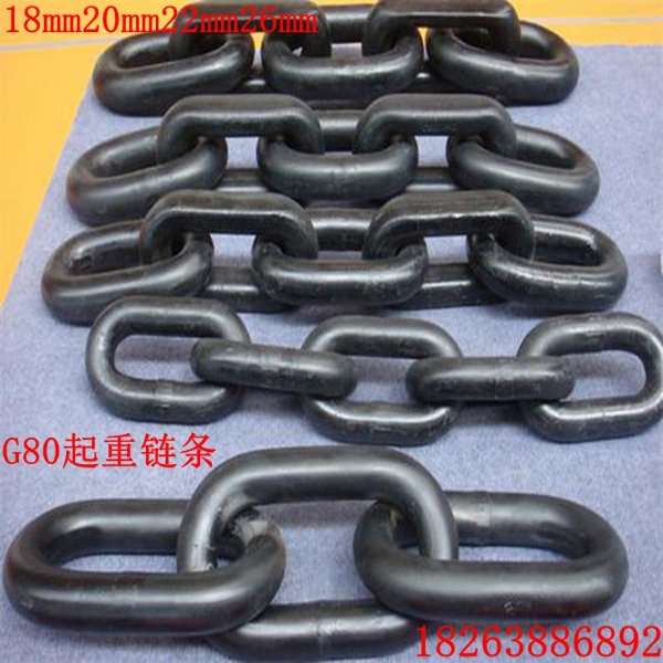 高强度起重链条按其强度分可为80级起重链条,70级起重链条,60级起重链条,43级起重链条、30级起重链条等,80级起重链条是我们专业打造的起重链条,市场上常用的80级起重链条常用规格为4×12,5×15,6×18,7×21,8×24,,9×27,11×34,10×30, 12×36,13×39,14×42,15×46,16×48,18×54,19×57,20×60,22×66,24×72,26×78, 30×90,32×96起重链条等,公司制造的80级起重链条规格齐全,安全系数达到4倍,2.5倍试验载荷,