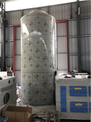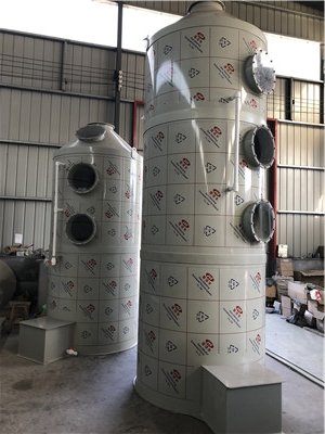 本设备分单塔体和双塔体。采用圆形塔体,用法兰分段联接而成。具体由贮液箱、塔体、进风段、喷淋层、填料层、旋流除雾层、观检窗、出风口等组成。