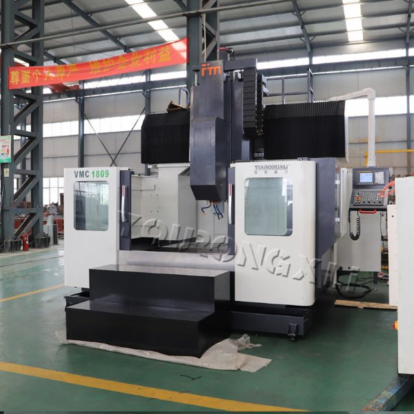 VMC1809型立式定梁数控龙门加工中心是集机、电、液等技术于一体的机械加工设备,主要用于平面、曲面和孔的加工。广泛应用于机械制造行业各种板类、箱体类、机架类等复杂零件的粗、精加工,该机床可实现立式铣头横向(Y轴)、垂直运动(Z轴)与工作台纵向运动(X轴)的三轴联动。可进行铣、镗、钻、刚性攻丝、铰孔、锪孔等多工序加工。