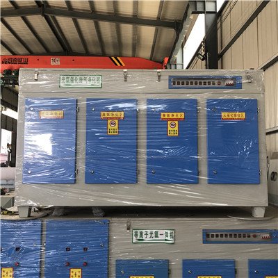 利用特制的高能高臭氧UV紫外线光束照射废气,裂解工业废气的分子链结构,使有机或无机高分子恶臭化合物分子链,在高能紫外线光束照射下,降解转变成低分子化合物,如CO2、H2O等。利用高能高臭氧UV紫外线光束分解空气中的氧分子产生游离氧,即活性氧,因游离氧所携正负电子不平衡所以需与氧分子结合,进而产生臭氧。UV+O2→O-+O*(活性氧)O+O2→O3(臭氧),众所周知臭氧对有机物具有极强的氧化作用,对工业废气及其它刺激性异味有立竿见影的清除效果。工业废气利用排风设备输入到本净化设备后,净化设备运用高能UV紫外线光束及臭氧对工业废气进行协同分解氧化反应,使工业废气物质其降解转化成低分子化合物、水和二氧化碳,再通过排风管道排出室外。无任何副作用。完全超越了传统的臭氧等空气净化器,能在有人在场的环境中持续灭菌、除尘,对人体无害副作用,能广譜地截获杀灭空气中的各类细菌,有效去除可吸入颗粒.可在很短的时间内将污染空气中的有害成分氧化分解为无害的产物和水。