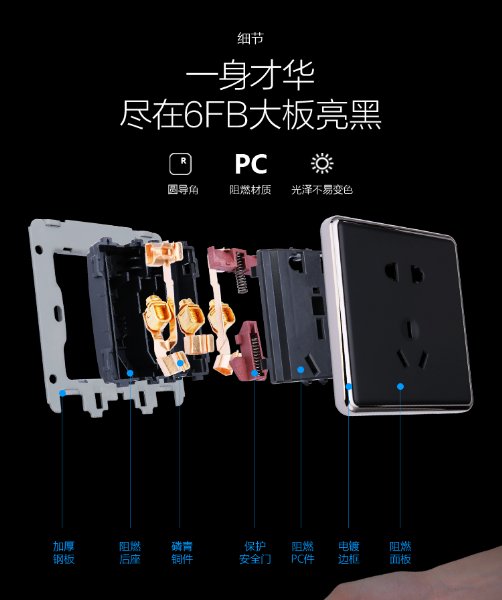 3.座面板材料:选用PC料、光泽好、耐高温、抗冲击、不变色;后座采用透明阻燃、耐高温,线盒内预留更大的空间,使用更放心。