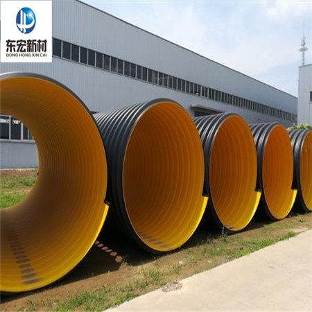 延安hdpe与钢熔融复合的结构构壁管,管壁结构由三个层次构成:内层是一个连续实壁内层管,内层管外缠绕复合有用钢板折成倒“U”型的环形波状钢板增强体,在涂复波状钢板增强体外复合有与钢板增强体波形相同的hdpe外层。