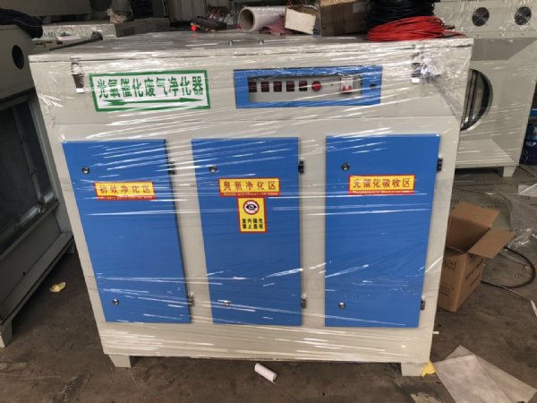 5000风量的光氧净化器由机箱体(尺寸:1.65*1.02*1.32m)、20根UV紫外线灯管(每根灯管耗电150W)、20组镇流器(每个镇流器控制一根UV紫外线灯管)、船型开关、控开、散热风扇、过滤网、催化板(进行催化反应)、活性炭吸附棉2块(对气体进行吸附处理)。