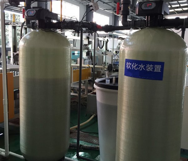 含有硬度的原水通过离子交换树脂,阳离子交换树脂巨大的表面积,可使水中的钙镁离子与树脂中的钠离子发生置换反映,从而保证出水硬度小于0.03㎜ol/L。其化学反应为2RNa+Ca2+(Mg2+)=R2Ca(Mg)+2Na2+反应结果:水中的钙、镁离子进入树脂中,树脂中的钠离子进入水中,从而起到软化的结果。当钙镁型树脂(即失效树脂)达到一定程度,出水硬度超标时,即进行失效树脂的再生工作。利用较高浓度的氯化钠溶液通过失效的树脂,使失效的树脂重新恢复至钠型树脂。其化学反应为:R2Ca+2Na+=2RNa+Ca2+。
