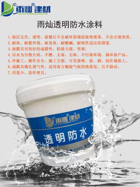 雨灿透明防水外观为透明单组份水性环保产品,采用特种高分子共聚物为基料,经多种改性助剂研制而成的新型防水, 该产品具有成膜性、柔韧性、耐磨性、透气性和优异的耐候性。可直接涂刷于墙面瓷砖、石材、水泥混凝土等基层上,不起皮、粉化,防止水泥返碱,有效防止基材的渗水现象,使用寿命长,为增强墙面的耐久性提供了可靠的保障。