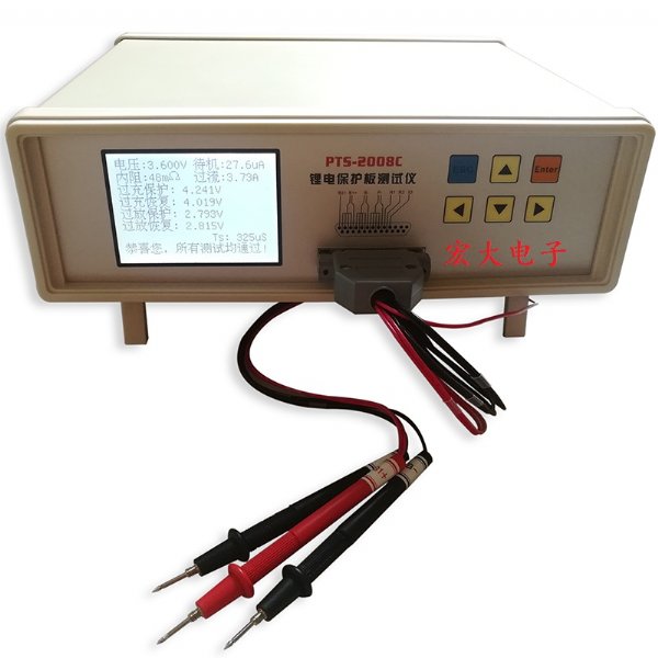深圳市宏大电子设备有限公司所生产的PTS-2008C锂电池保护板测试仪可以快速测量1~2节锂电池保护板,为了同时兼顾快速批量测试和高精度测试,特设两种测试模式 1,快速测试,1秒钟内判断一块保护板好坏(根据保护延迟时间不同会有不同),启动快速测试无需按键,接上保护板自动启动测试。