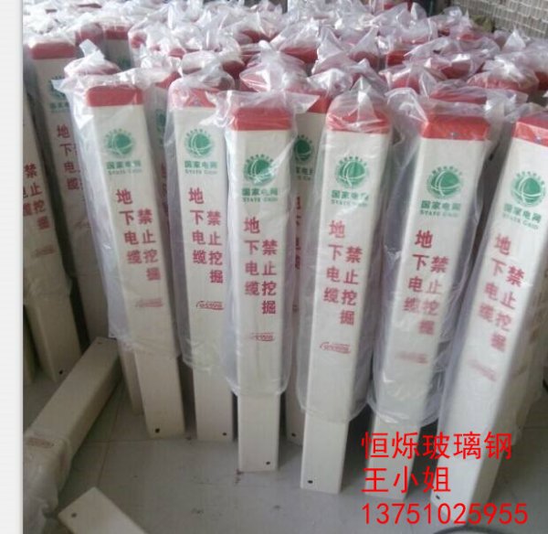玻璃钢电力标志桩的应用,有效解决了传统玻璃钢电力标志桩不醒目,警示作用发挥不充用等问题,使电缆路径更力清晰明了,为正确指导挖掘机、铲车等大型机械设备现场作业提供了有效支持,为有效避免外力破坏,降低线路故障,提高供电可靠性发挥了积极作用,同时还有力地提升了企业标准化管理新形象,具有显著的社会效益和经济效益。随着社会的飞速发展,玻璃钢电力标志桩也在发展,从以前的石头、水泥标志桩发展到现在的玻璃钢电力标志桩,带来具大的社会效益和经济效益.