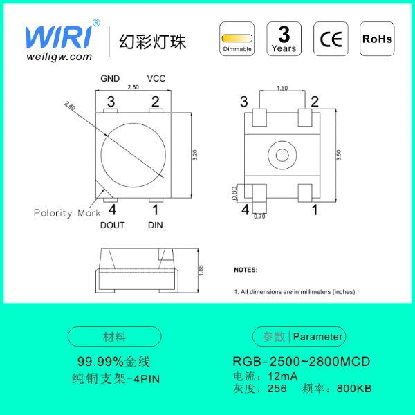 灯珠采用99.99金线和纯铜支架材料,芯片采用全套三安芯片,亮度可达2500~2800MCD,IC芯片来自于台湾制造,性能稳定可靠;芯片精细分选,使发光效果的一致性优越;灯珠可兼容市场多款型号,编程可选择:SK6812,WS2812型号进行编程效果;