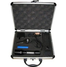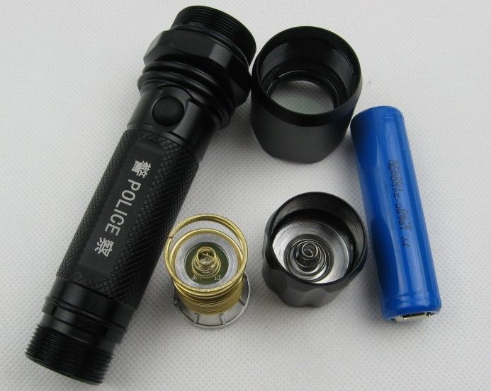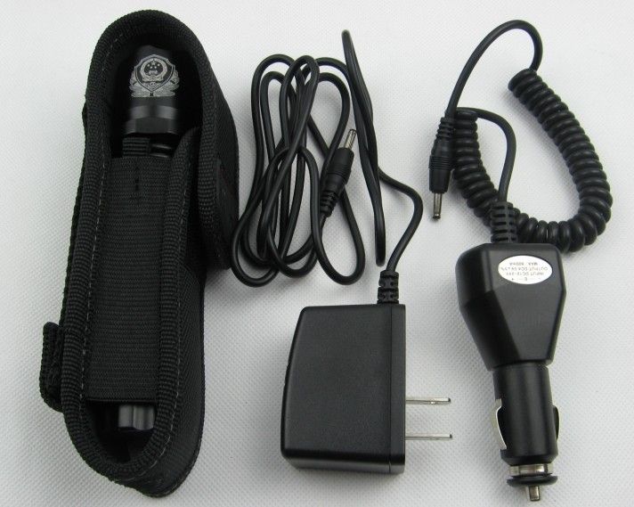 充电警用强光手电筒,航空级6061-T6高档高硬度铝合金材质,带1粒美国进口Cree Q5白色LED,带1粒18650可充锂离子电池,带前部按键式开关-ON/OFF,带3档功能(强光-弱光-爆闪),带车充、直充、挂绳,高档铝合金礼品盒。